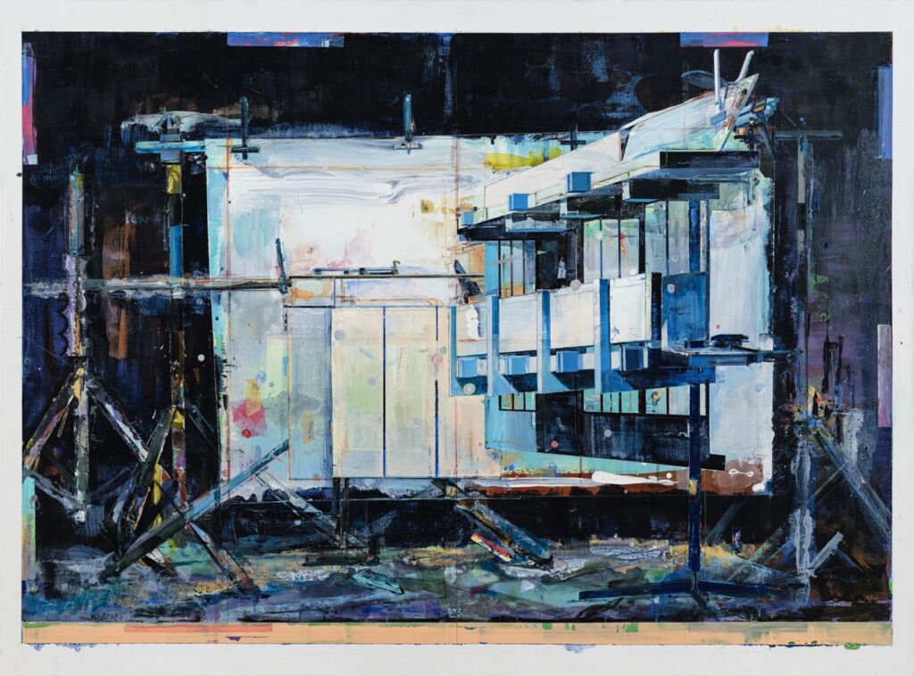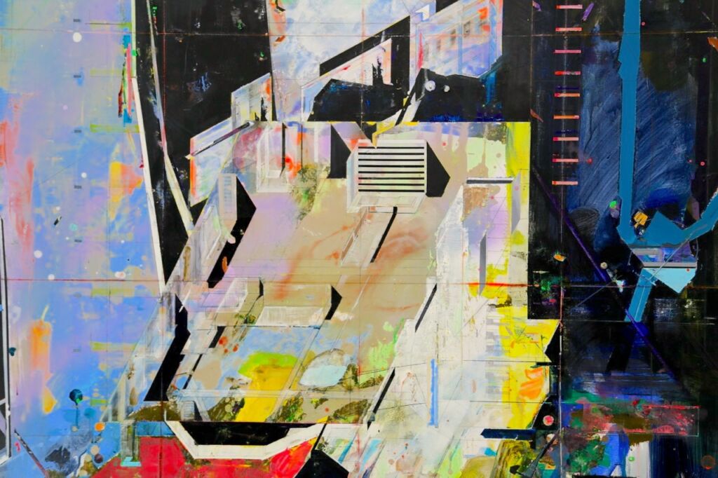他的平面藝術透過類似建築的元素,來貼近當代這個議題,但其實仔細看他所畫的建築結構,似乎都是有點殘缺,也很難具體落實,好像有點烏托邦的情境感,甚至帶點廢墟感,而在我們的認知裡,藝術家畫布裡的世界,理當是完美的,是完整的,但陳建榮幾乎是用錯覺式的拼貼手法,讓作品呈現一種混亂中又帶有一點秩序,甚至有未完成的感覺,但其實畫家已經是完成作品,也把他的意圖完整呈現,只是因為與觀賞者的期待心理有所落差,而造成一種未完成的錯覺。