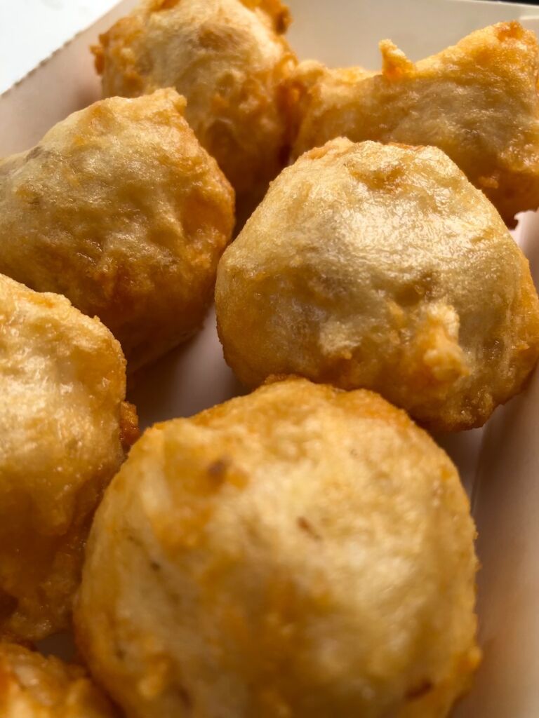 另外他們的鹹水吳郭魚絕對沒有土味和魚腥味,手掌大小,剛好可以一人一隻的享用。這次前來,由於疫情的關係,只能外帶,而處女蟳因為要等,所以這次就買了沙母、現炸花枝丸和蚵仔麵線而已,不然在車裡用餐,真的不方便一次買太多好料。